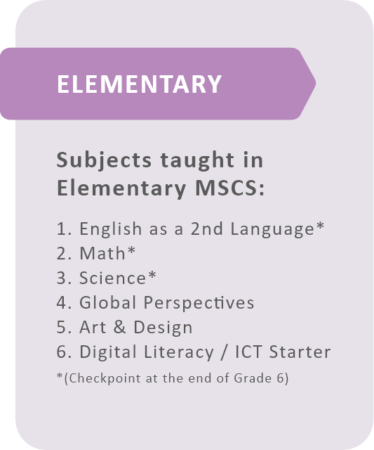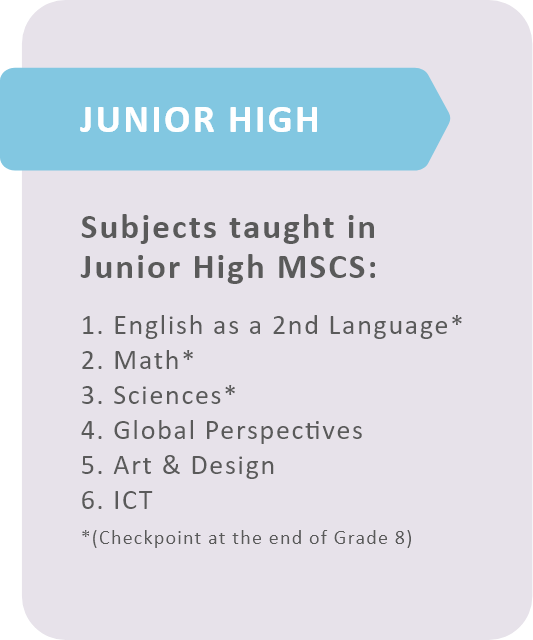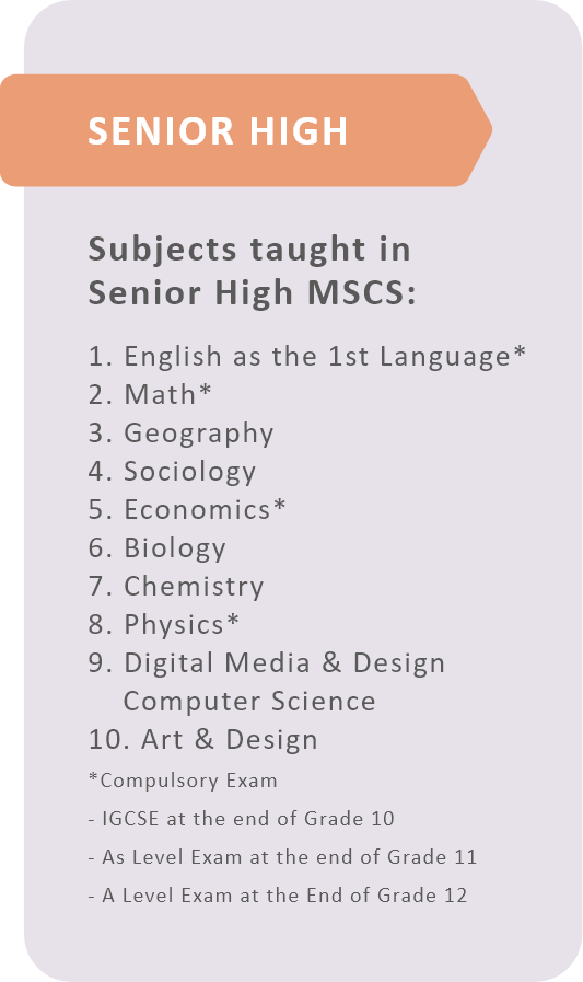Cambridge curriculum is implemented starting Elementary level, gradually moving to Junior and Senior High. The students in Elementary level and Junior High study foundational subjects English, Mathematics, and Science and are going in depth each year. It is accompanied by three other complementary, yet essential skills in Art and Design, Digital Literacy/ICT (Computer) and Global Perspectives. Global Perspectives is an exceptional skill-based subject that breaks the wall of content-based subjects and focuses on learning high research skills. It concentrates more on critical thinking, information skills, independent learning skills, collaboration and communication skills which are the building blocks of important 21st century skills.